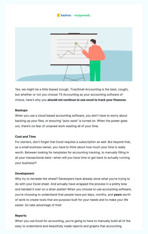 Another post-conversion nurture campaign the team is offering is educational content tailored towards more specific accounting functions. Think: managing accounts receivable, GAAP fundamentals, or managing expenses. As part of this journey, they also remind users of key pain points. One that always stands out is most small businesses’ over-reliance on Excel, which provides no backups, fees, and a steep learning curve!